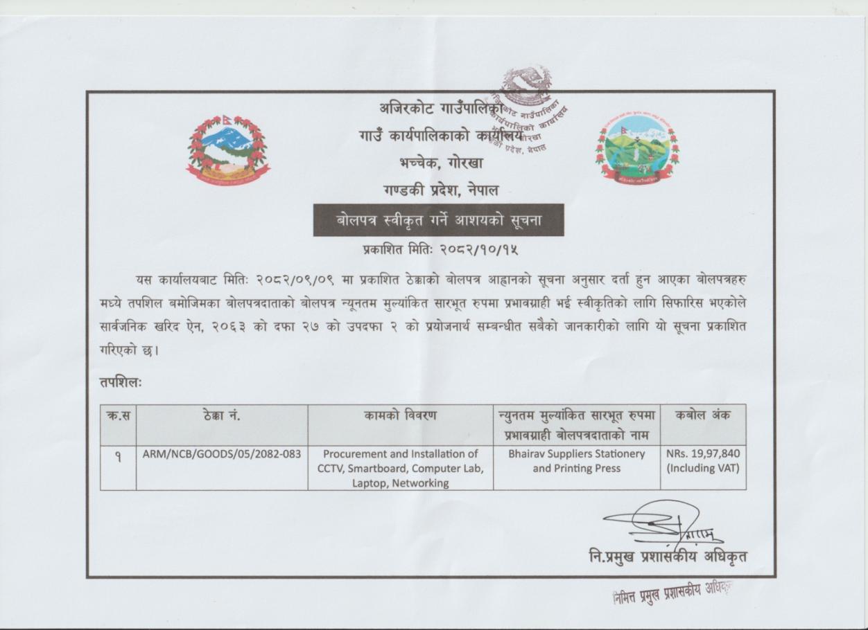 बोलपत्र स्वीकृत गर्ने आशयको सूचना ।