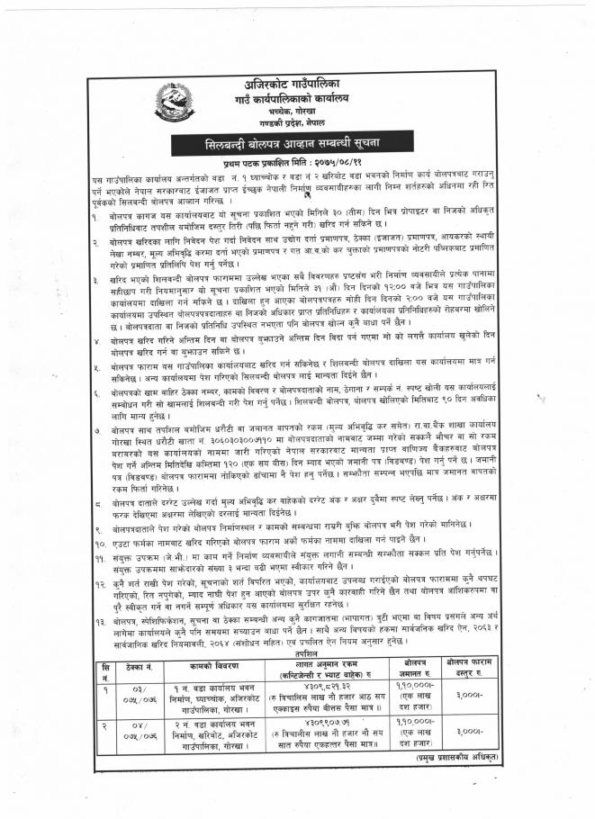 बाेलपत्र आह्वान सम्बन्धी सूचना ।।