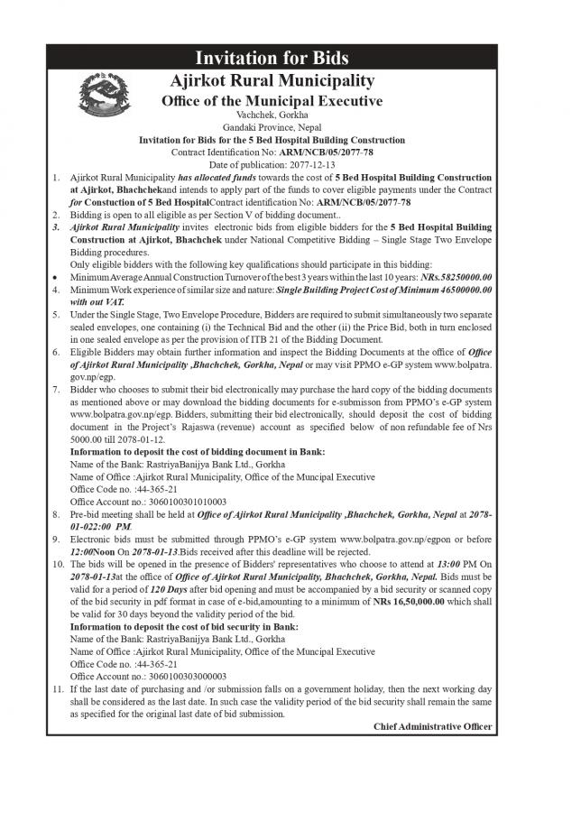 Invitation for Bids for the 5 Bed Hospital Building Construction