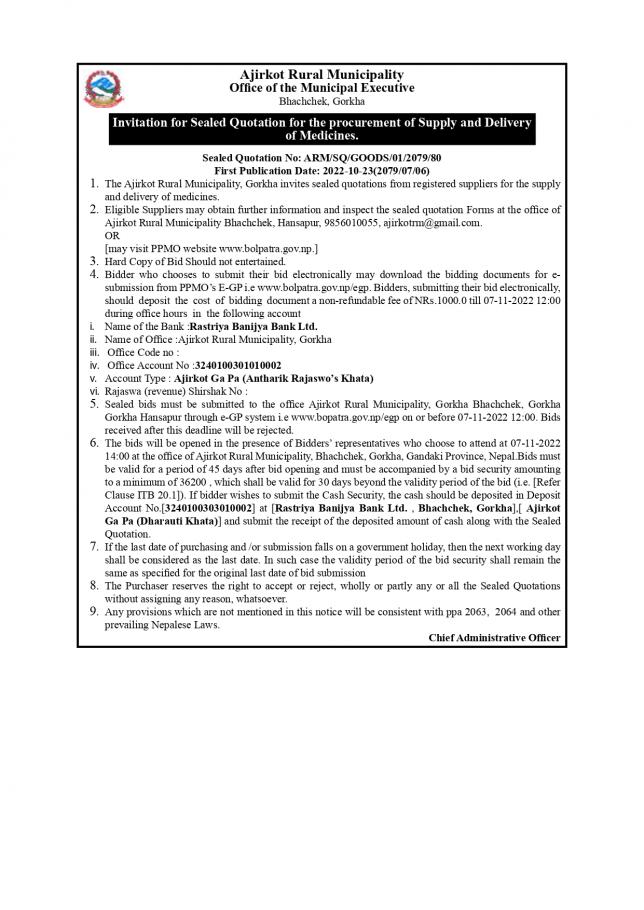 » Invitation for sealed quotation of supply and delivery of medicine 2079