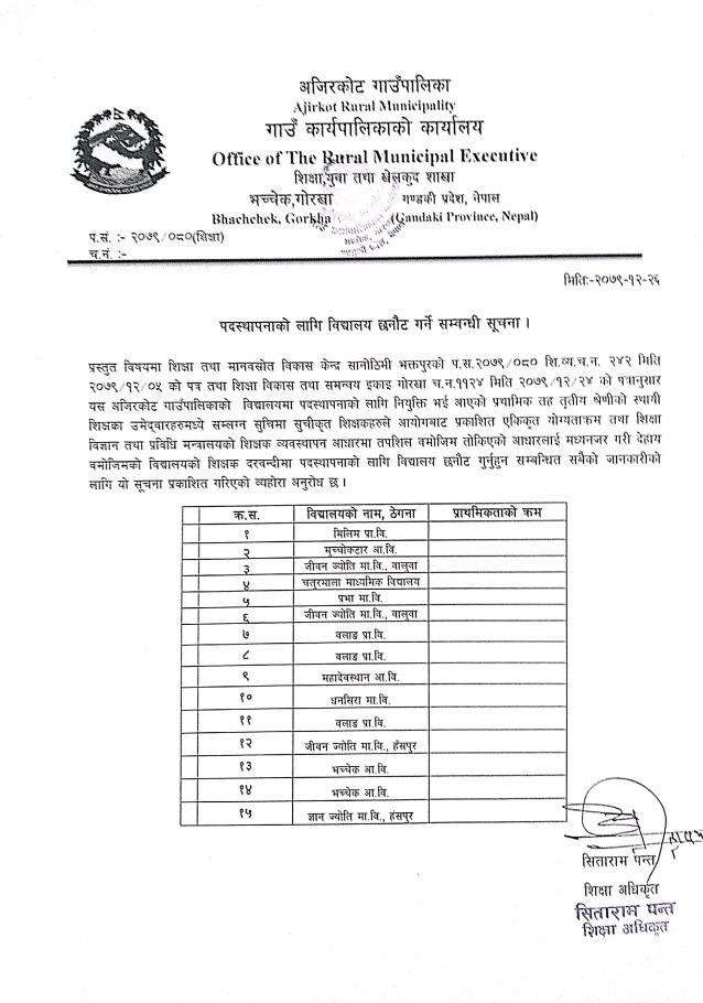 » पदस्थापनIका लागी विद्यालय छनौट गर्ने सम्बन्धी सूचना