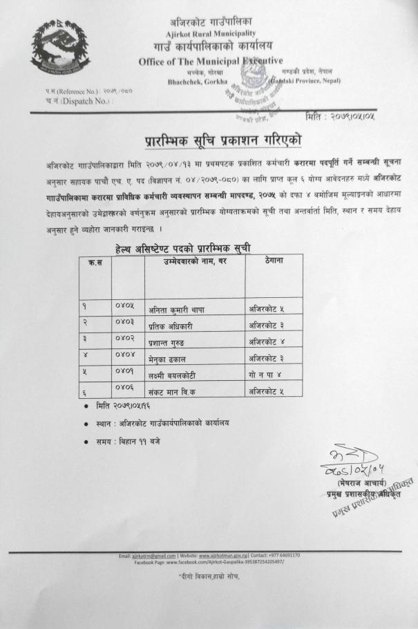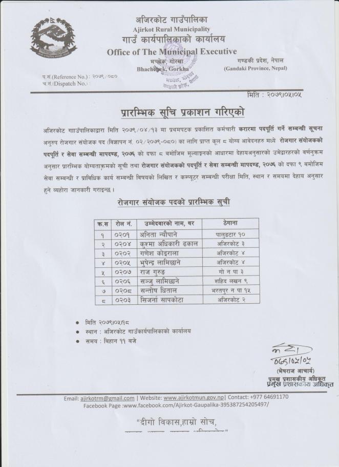 प्रारम्भिक सूची प्रकाशन तथा परिक्षा संचालन सम्बन्धी सुचना ।